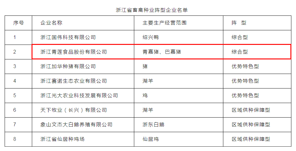 9月14日,浙江省農(nóng)業(yè)農(nóng)村廳、浙江省科學技術(shù)廳公布了浙江省種業(yè)陣型企業(yè)名單,其中浙江青蓮食品股份有限公司被認定為省畜禽種業(yè)綜合性陣型企業(yè)。