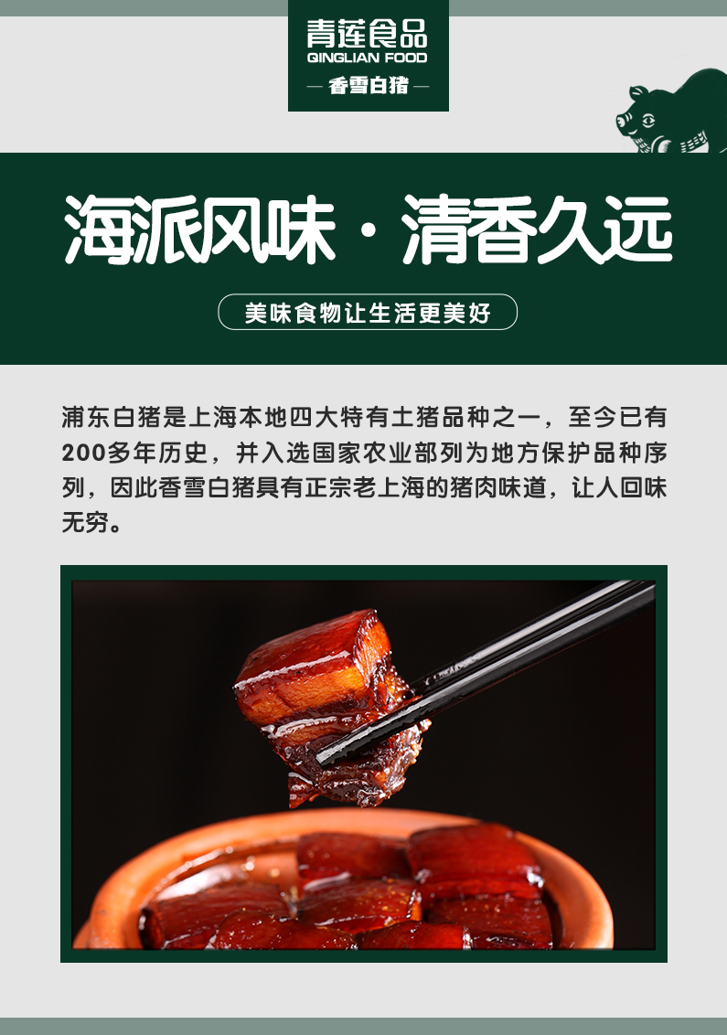 香雪白豬具有“海派風味,清香久遠”的特點,其肉質鮮美,細膩多汁,肥肉和瘦肉比例適當,正宗老上海的豬肉味道令人回味無窮。