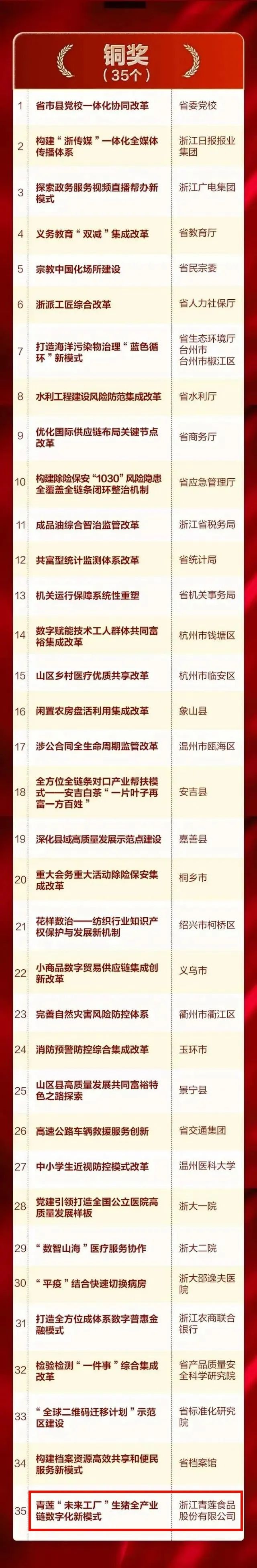 重磅!青蓮食品—膳博士榮獲浙江改革突破獎銅獎! 2023-02-02 08:37:26 浙江青蓮食品股份有限公司 瀏覽次數(shù) 6625 近日,浙江省委改革辦公布了2022年度浙江省改革突破獎名單。浙江青蓮食品股份有限公司“數(shù)智青蓮”未來工廠榮獲2022年度浙江省改革突破獎銅獎,是銅獎組中唯一的一家民營企業(yè)。20多年來,青蓮食品構(gòu)建起從農(nóng)場到餐桌的透明全產(chǎn)業(yè)鏈,在改革創(chuàng)新中以種業(yè)為源頭,建立起未來農(nóng)場—未來工廠—產(chǎn)業(yè)新零售等數(shù)字化應(yīng)用,真正從用戶需求出發(fā)為社會提供優(yōu)質(zhì)食品!此次獲得浙江改革突破獎銅獎,更是對青蓮食品數(shù)字化轉(zhuǎn)型成果的肯定和勉勵!實現(xiàn)黑豬專家膳博士在安全和美味雙升級上硬核突破!身為黑豬專家,膳博士服務(wù)過世博會、世乒賽、國際馬拉松比賽,連續(xù)8年為世界互聯(lián)網(wǎng)大會供肉,連續(xù)14年為中國極地研究中心供肉,成為杭州亞運會官方生鮮肉類產(chǎn)品供應(yīng)商。以國家級嘉興黑豬和兩頭烏保種場作為種業(yè)基礎(chǔ)繁育國家級優(yōu)質(zhì)新品種,形成完整的黑豬商品體系為消費者帶來舌尖體驗。近年來,通過智慧養(yǎng)殖為傳統(tǒng)畜牧產(chǎn)業(yè)數(shù)字化轉(zhuǎn)型先行探路,以新一代信息技術(shù)為手段,重塑生豬全產(chǎn)業(yè)鏈生產(chǎn)組織方式和管理服務(wù)模式,構(gòu)建“1+4+N”模型,推動全產(chǎn)業(yè)鏈數(shù)字化轉(zhuǎn)型。產(chǎn)業(yè)零售端以用戶需求為中心持續(xù)推出膳博士黑豬鮮肉鮮制系列產(chǎn)品提升消費體驗,滿足國人對美好生活、品質(zhì)食品的向往。2022年,青蓮智慧牧場首批入選浙江省“未來農(nóng)場”,“數(shù)智青蓮”未來工廠獲全省數(shù)字化改革“最佳應(yīng)用”和全省數(shù)字經(jīng)濟系統(tǒng)“最佳應(yīng)用”。在全省數(shù)字化改革大會上做匯報演示,列入全省數(shù)字經(jīng)濟系統(tǒng)地方特色應(yīng)用目錄,受到央視、省級、市縣級等媒體持續(xù)關(guān)注報道。 上一條“風云浙商”許明曙:人生把一件事做好就很不容易 下一條全國唯一!膳博士·香雪白豬獲2022年度國家新品種認定!